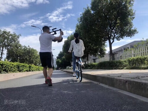 片子其中女主骑车上班的场景,制片开车载着摄影老师扛着机器进行拍摄。